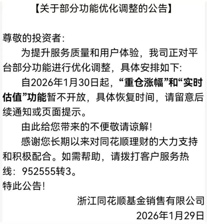 以同花顺为例,其于近日公告,自1月30日起暂停"重仓涨幅"与"实时估值"功能,以提升服务合规性;京东金融则先行一步,于1月29日即下架"基金估值"功能,并同步关闭"实盘牛人榜"等可能引发跟风交易的数据展示板块。此类调整旨在减少盘中估算净值对投资者的非理性诱导,引导长期价值投资理念。