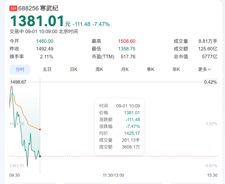 今日,寒武纪开盘大跌,截至发稿跌幅超过7%,股价低于1400元。